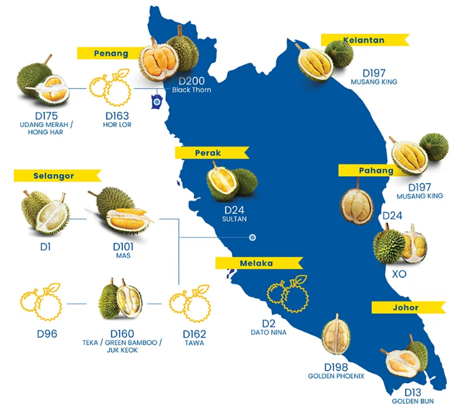 在馬來(lái)西亞,大約有200個(gè)榴蓮品種有自己獨(dú)特的風(fēng)味和香氣。同時(shí)它們也對(duì)適宜的生長(zhǎng)條件也特定的需要,例如降雨,海拔,溫度和土壤結(jié)構(gòu)。榴蓮僅在成熟季節(jié)才有供應(yīng)那發(fā)生在每年的六月和七月。那個(gè)時(shí)節(jié)成熟后從樹(shù)上自然掉落的榴蓮,往往會(huì)含有較多的果肉和更濃郁的香氣。